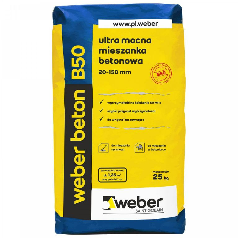 Weber beton B50 to sucha mieszanka cementu, kruszyw oraz dodatków, gotowa do użycia po wymieszaniu z wodą.