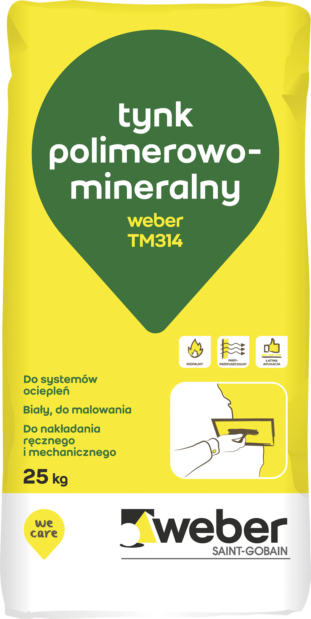 Polimerowo - mineralna zaprawa tynkarska weber TM314 jest przygotowaną fabrycznie suchą mieszanką tynkarską, dostarczaną w workach, gotową do użycia po uprzednim rozmieszaniu z wodą na placu budowy. Produkt oparty jest o spoiwa cementowe i wapienne oraz mineralne kruszywa strukturalne. Tynk przeznaczony jest do dwukrotnego malowania farbami elewacyjnymi Weber.