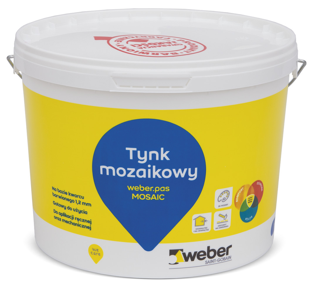 Weber.pas mosaic jest gotowym do użycia tynkiem mozaikowym na bazie żywicy akrylowej i barwionego kruszywa kwarcowego. Spełnia wymagania normy PN-EN 15824.