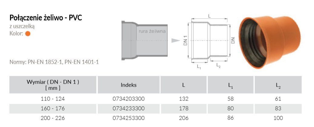 Pozwala na przejście z kanalizacji żeliwnej na polipropylen. Żeliwo na bosy koniec z uszczelką, PVC w kielich.