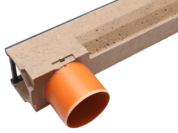 - Przyłączenie do kanalizacji poprzez korytko z otworem odpływowym i zamontowanym króćcem DN 110, opcjonalnie z zasyfonowaniem.
