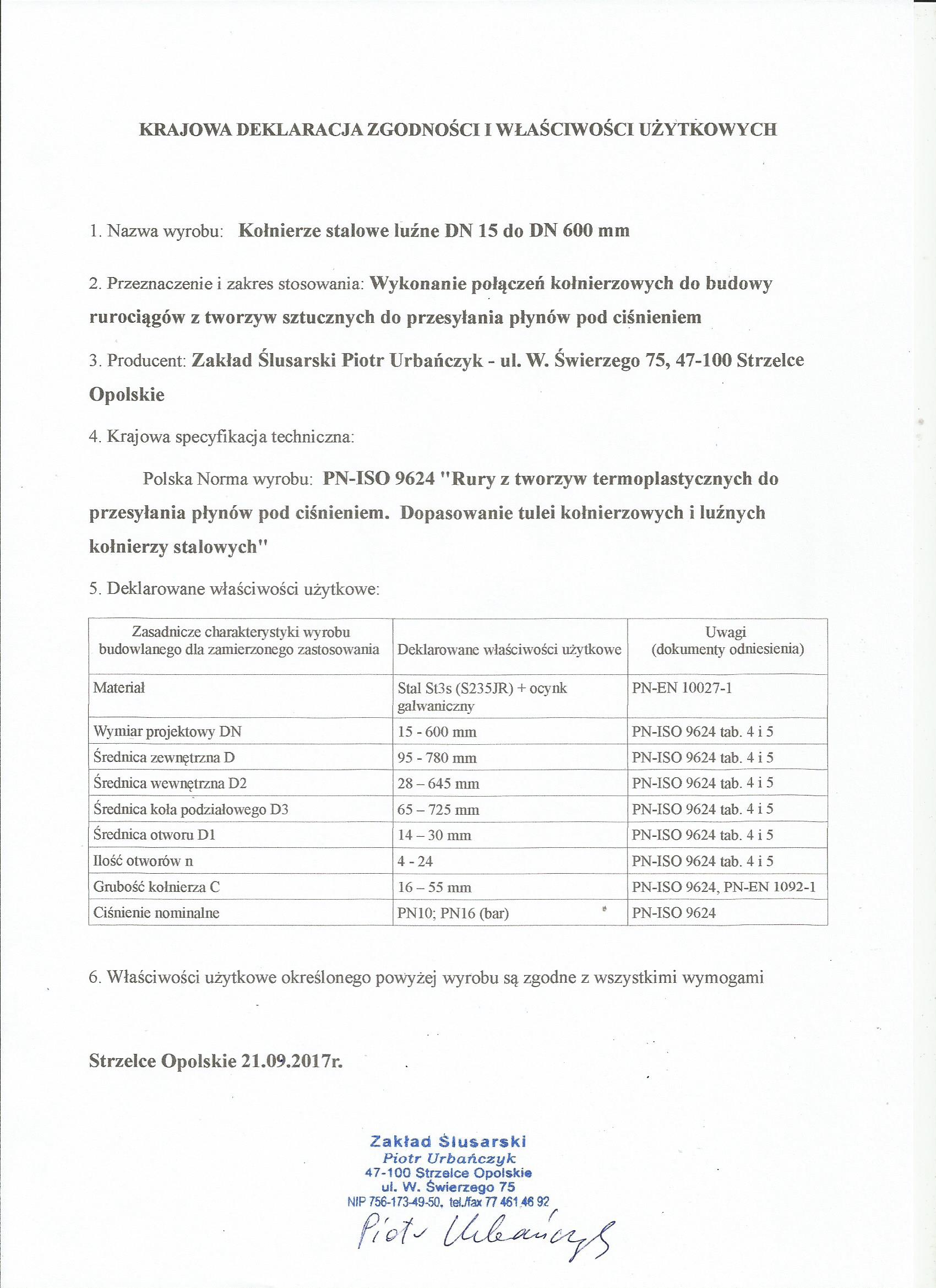 Kołnierz wykonany jest ze stali galwanizowanej. W zależności od wielkości umożliwia pewne połączenie przy pomocy 4,8 lub 12 śrub. Kołnierz poddawany jest siłom nacisku (przez skręcone śruby) oraz naporowi hydrostatycznemu cieczy.
