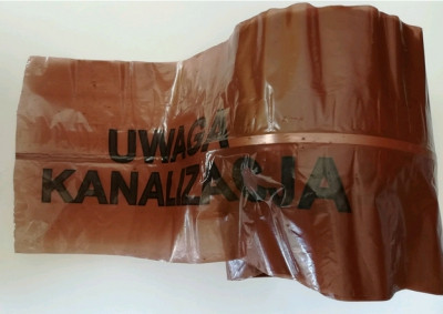 Taśma, folia lokalizacyjna ostrzegawcza brązowa KANALIZACJA z wkładką stalową z nadrukiem "UWAGA KANALIZACJA" do oznaczania tras przebiegu sieci kanalizacyjnej szerokość 200mm długość 100m.