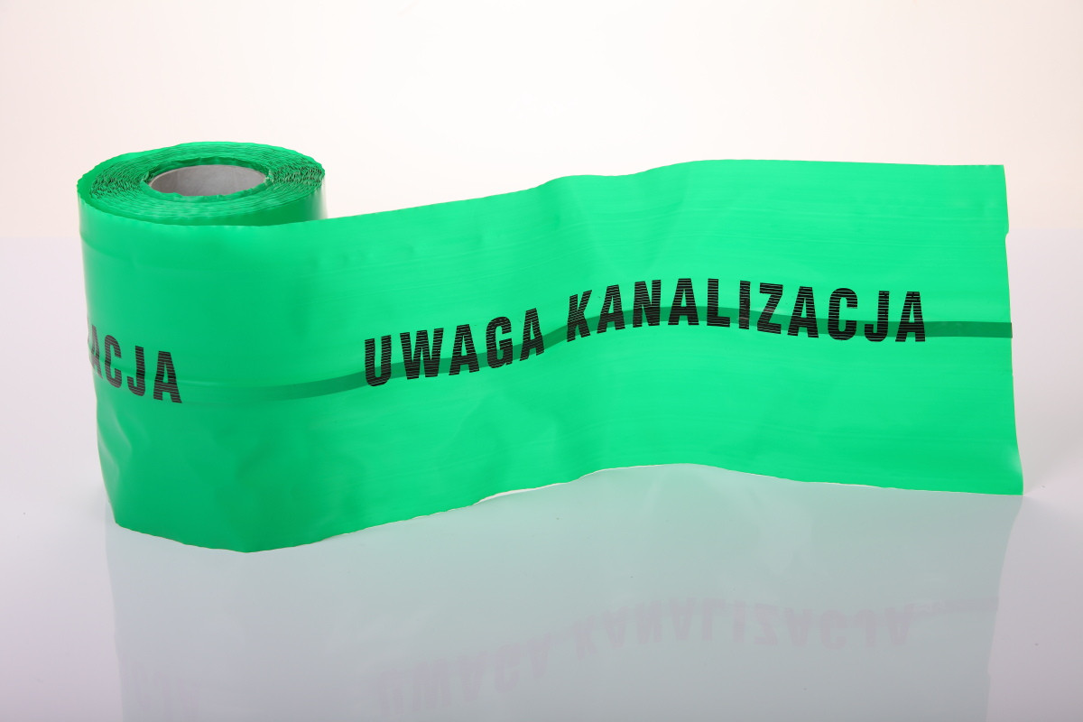 Taśma, folia lokalizacyjna ostrzegawcza zielona KANALIZACJA z wkładką stalową z nadrukiem "UWAGA KANALIZACJA" do oznaczania tras przebiegu sieci kanalizacyjnej szerokość 200mm długość 100m.