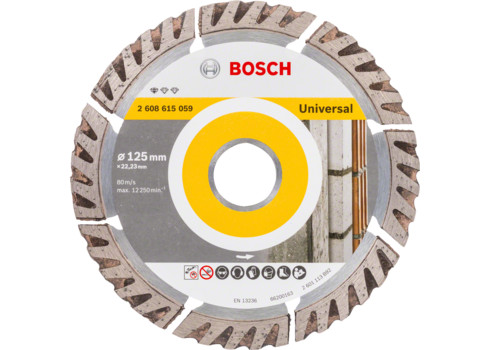 Diamentowa tarcza tnąca Standard for Universal umożliwia skuteczne cięcie w popularnych materiałach budowlanych. Zoptymalizowana osnowa diamentowa zapewnia solidne rezultaty dzięki wysokiej jakości wykonania tarczy. O utrzymanie tych standardów dba znajdujące się w Szwajcarii centrum kompetencyjne Bosch w zakresie technik diamentowych. Produkt przeznaczony do cięcia materiałów budowlanych, takich jak beton czy podłoże z muru.