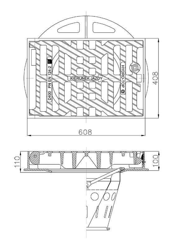 Wpust uliczny 3/4k D-400 H100 uchylny ryglowany Hydro-Top, żeliwo szare, przystosowany do montażu kosza, niemalowany, powierzchnia odpływu ok. 1000 cm2