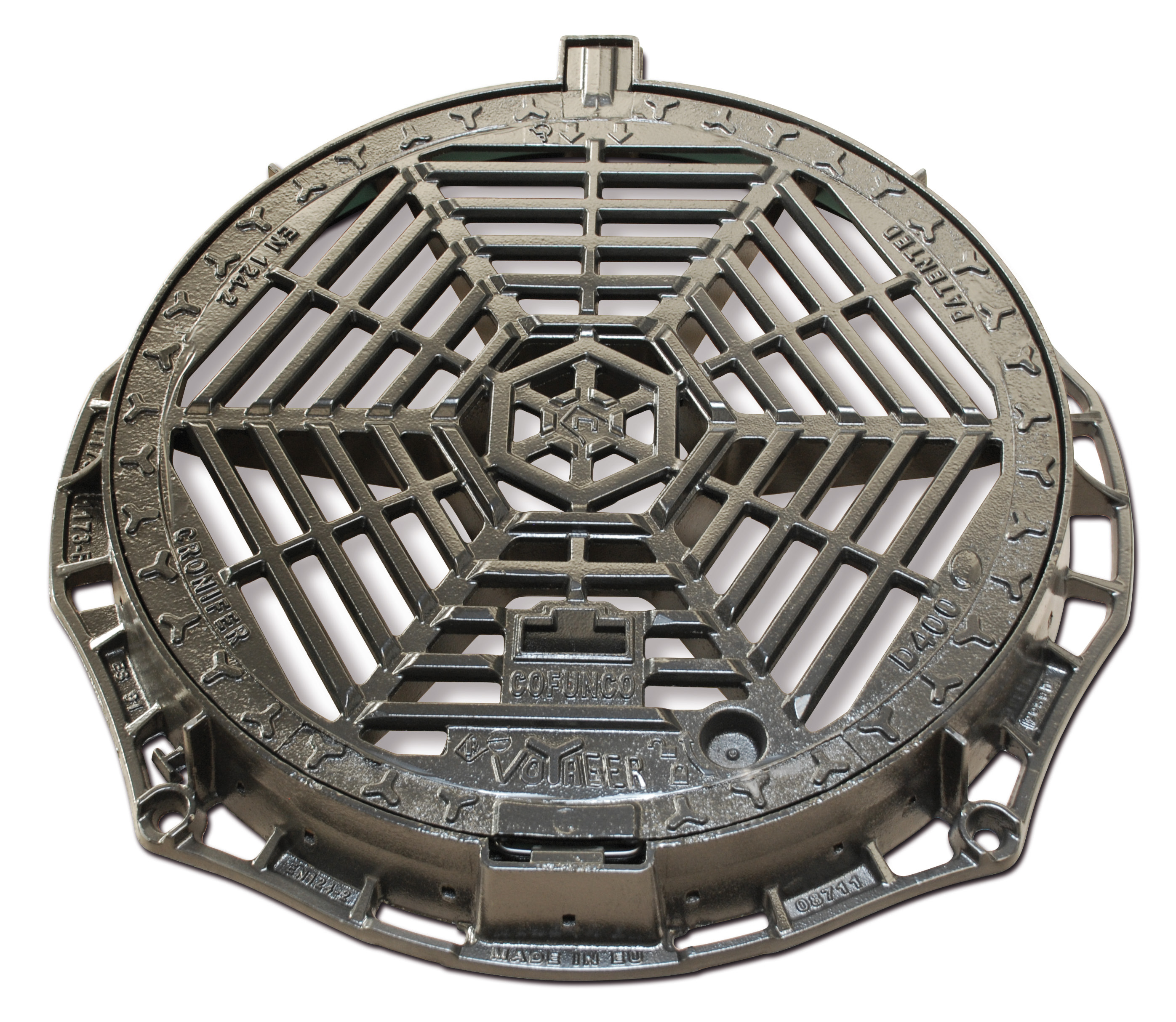 Wpust uliczny żeliwny klasy D400 wolny prześwit 600 mm COFUNCO do zwieńczenia zwieńczania studzienek kanalizacyjnych. Równie często nazywany włazem ażurowym zgodny z normą europejską PN-EN 124-2:2015-07, do jego produkcji użyto żeliwa sferoidalnego wytwarzanego zgodnie z normą europejską GS ISO 1083/EN1563, sferoidalność > 95%, cementyt mniej niż 2%. Najlepsze jakościowo żeliwo sferoidalne, opatentowany stop Cronifer, własne formuły chemiczne, różne rodzaje stopów żeliwa sferoidalnego opracowane dla poszczególnych klas obciążeń D, E i F.