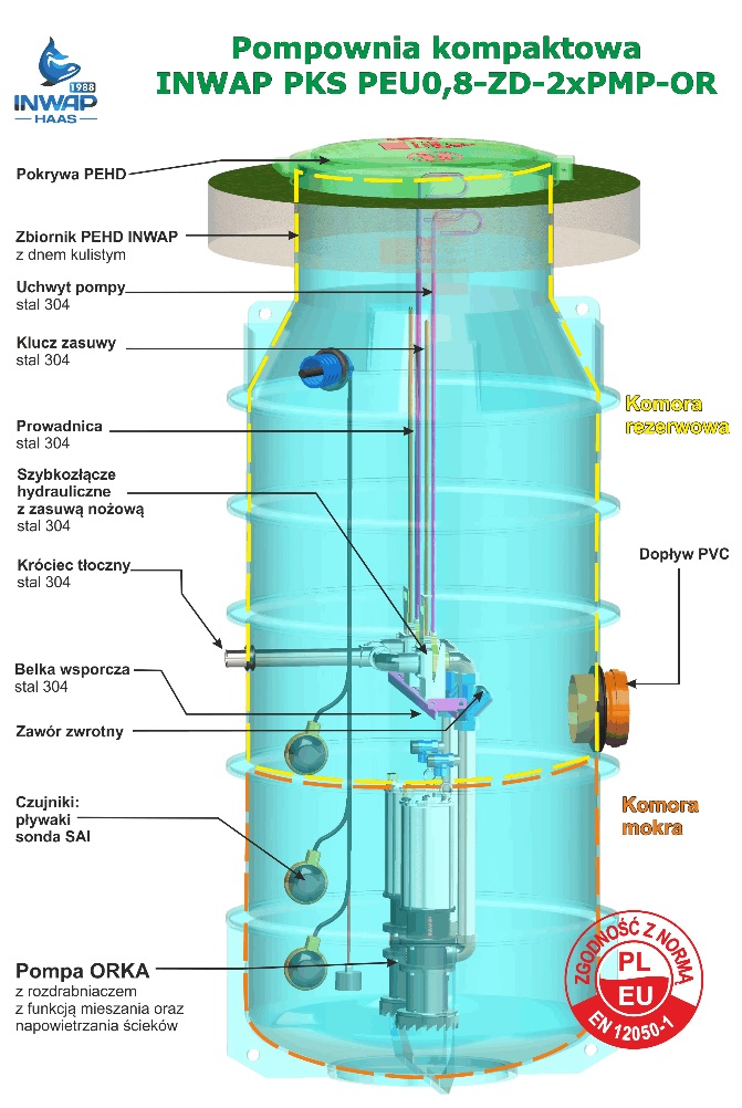Przepompownia przydomowa INWAP PEU0,8-ZL-2xPMP-ORKT Qmax=1,6l/s,Hp=60m, P=1,5kW, przewód 10mb, skrzynka sterująca SZS-1xPMP-E13M