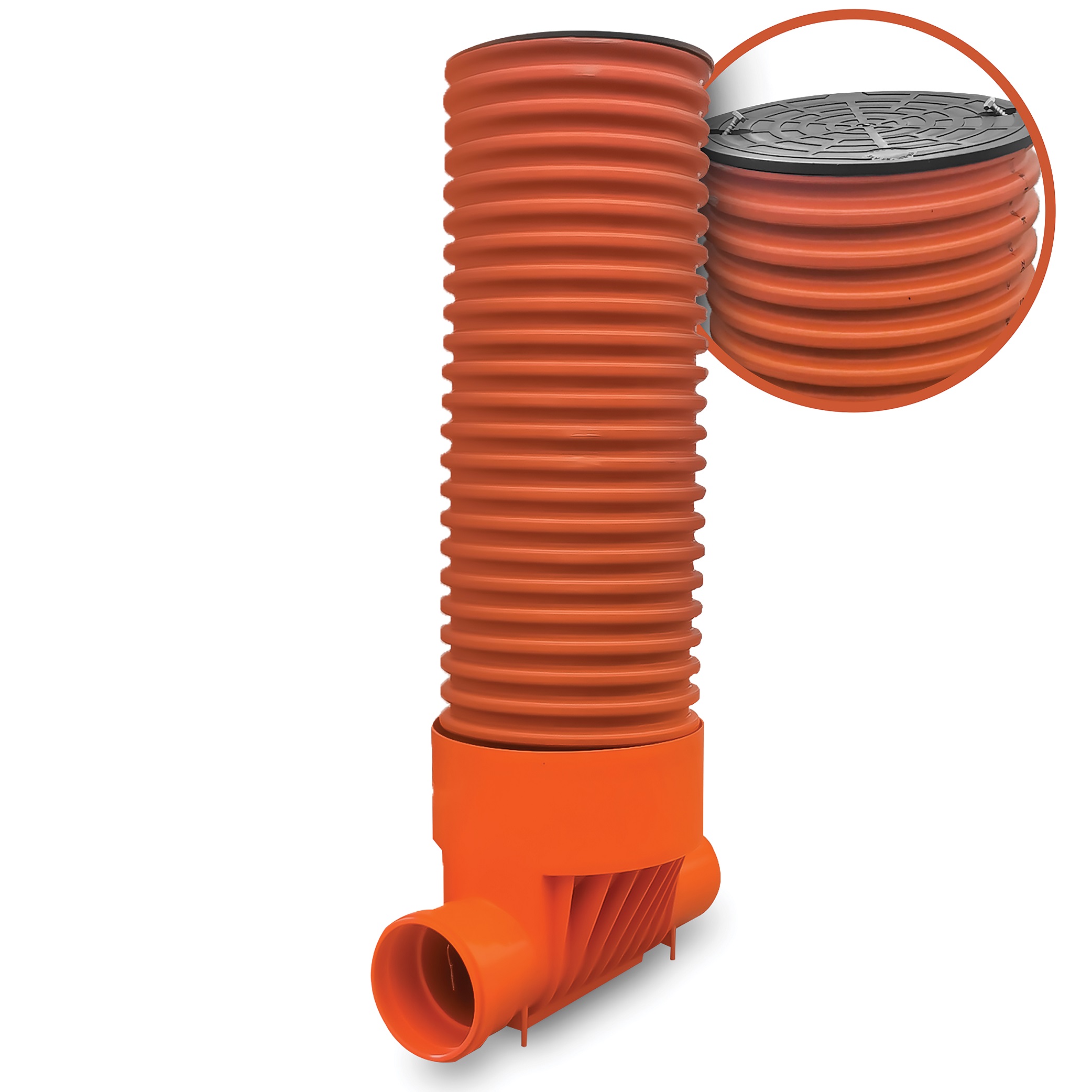 Kompletna studzienka kanalizacyjna z możliowścia podłączenia rur fi 160 (wejście i wyjście) przy podstawie i pokrywą z PP mocowaną na wkręty w komplecie.