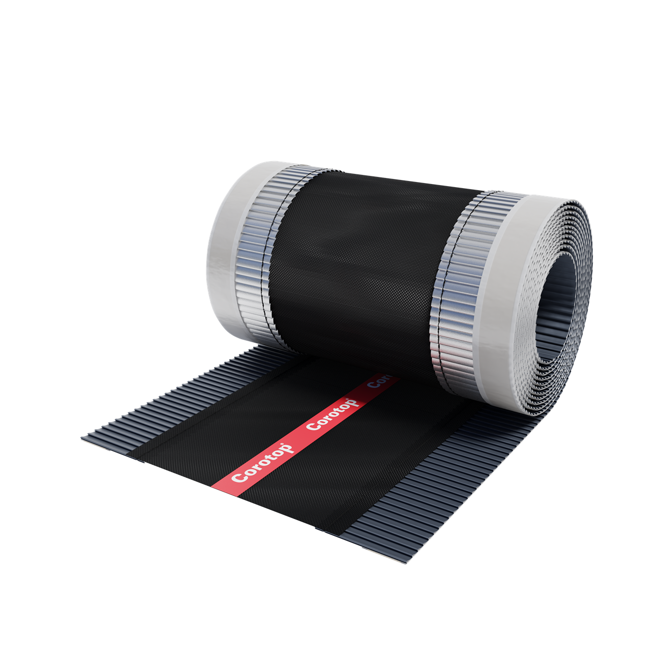 Taśma uszczelniająco-wentylacyjna wykonana z dwóch pasów profilowanego aluminiowego laminatu, tkaniny z włókna szklanego oraz butylowych pasów klejących.