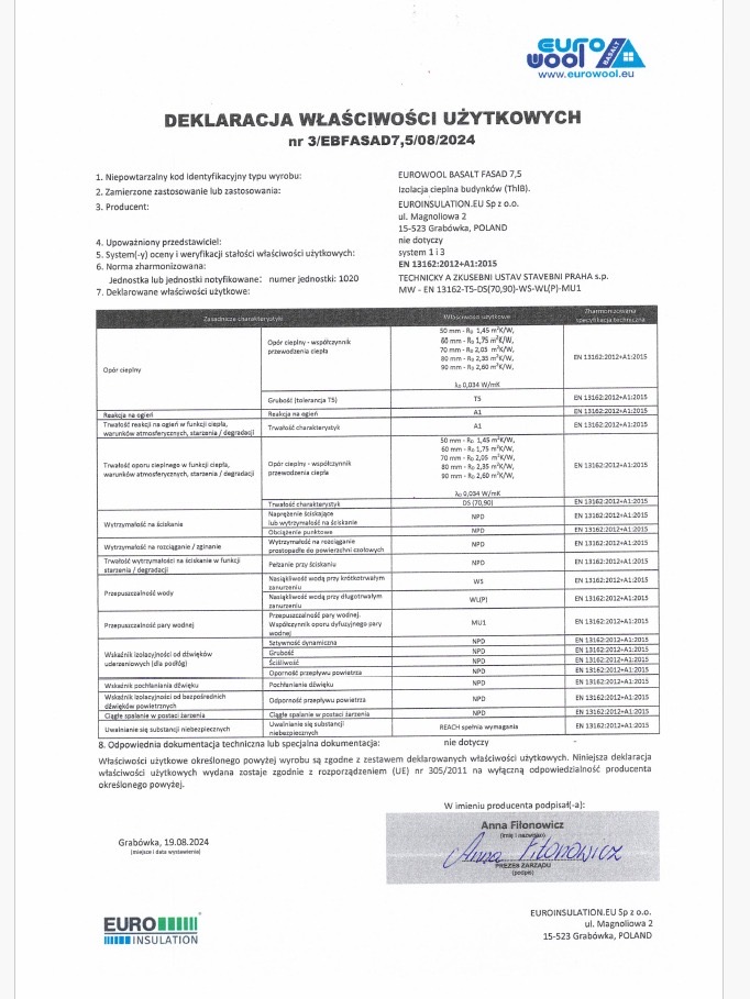 Wełna fasadowa 5 cm EUROWOOL BASALT; 0,034 W/mK; 1000x600 mm; 3,6 m2/pacz.; 115,2 m2/pal.