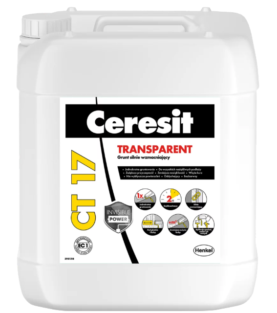 Ceresit CT 17, 20 l, paroprzepuszczalny grunt głęboko penetrujący do powierzchniowego wzmacniania wszelkich nasiąkliwych podłoży, umożliwiający kontrolę etapu prac dzięki żółtej barwie
