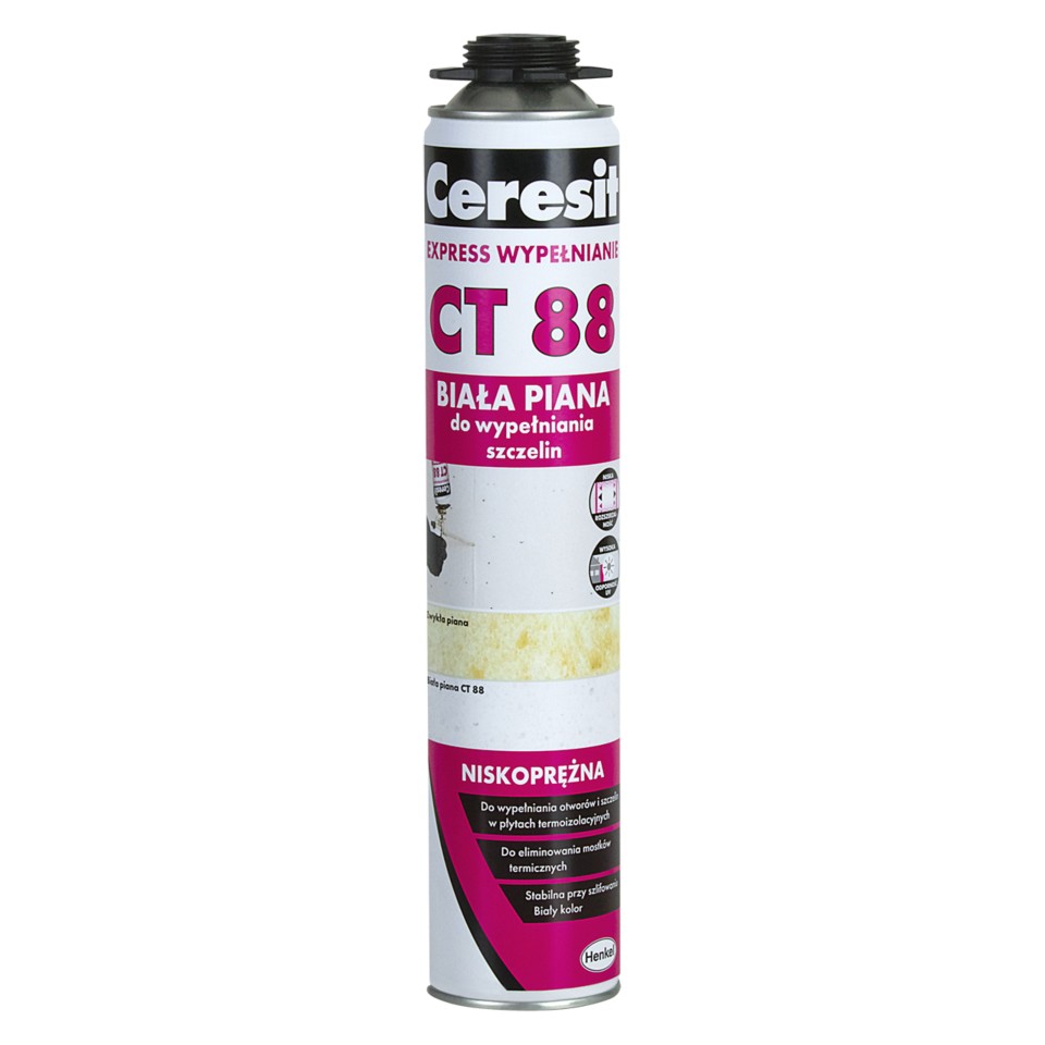 Ceresit CT 88 EXPRESS WYPEŁNIANIE, 750 ml, jednoskładnikowa, niskoprężna biała piana do wypełniania szczelin i uzupełniania ubytków w termoizolacji i szczelin w warstwie izolacyjnej systemów ociepleń z użyciem płyt styropianowych EPS i XPS