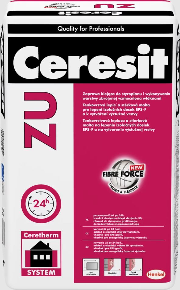 Ceresit ZU FIBRE FORCE, 25 kg, wytrzymała zaprawa do mocowania płyt styropianowych oraz do wykonywania na nich cienkiej warstwy zbrojonej siatką przy ocieplaniu budynków metodą lekką-mokrą