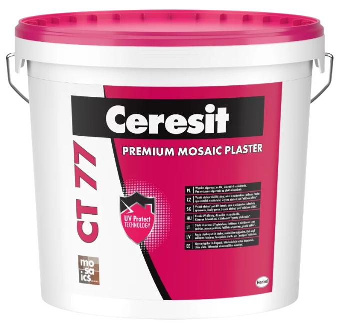 Ceresit CT 77 PREMIUM baza, 7,1 kg, tynk cienkowarstwowy, mozaikowy, silikonowo-akrylowy, uziarnienie 1,0-1,6mm, o wysokiej odporności na UV, dostępny w wielu kompozycjach kolorystycznych, gotowy do użycia